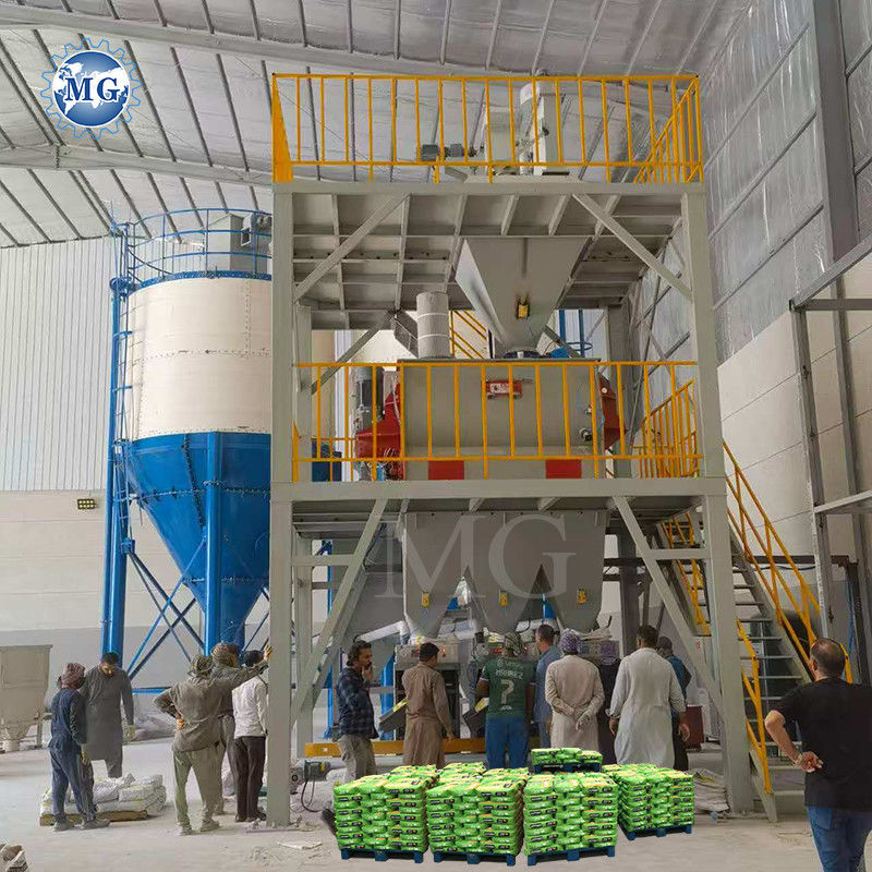 드라이 모르타르 혼합 플랜트가 작동할 때, 먼저 다양한 종류의 원자재가 버킷 엘리베이터 또는 펌프 트럭에 의해 사일로로 운반되고, 둘째, 다양한 종류의 원자재가 스크류 컨베이어에 의해 공식 비율로 원자재 사일로에서 자동 계량 스케일로 운반되고, 셋째, 프리믹스 원자재가 버킷 엘리베이터에 의해 프리믹스 호퍼로 들어 올려지고, 넷째, 프리믹스 재료가 트윈 샤프트 패들 믹서로 들어가 균일하게 혼합되고, 다섯째, 혼합된 재료가 자동 포장기로 들어가 포장되고, 마지막으로 포장된 가방이 벨트 컨베이어에 의해 다음 공정으로 운반됩니다.